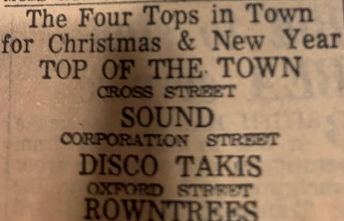 I particularly remember Top of the Town on Cross Street which used to have a record shop called Spin Inn at street level. The DJ in the late 60s and early 70s was called Gary Laine, I seem to remember and he managed the shop too.