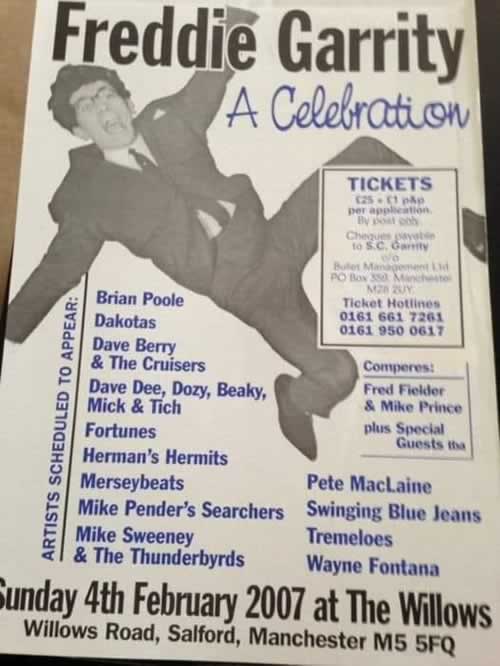 Went there to a fund raising benefit gig for Dave Morris who was too poorly to drum any longer for the Salford Jets. As I remember, the line up was as follows. The Dakotas, Herman's Hermits. Dave Berry and the Cruisers, The Troggs. Mike Sweeney's Thunderbirds, Dave Dee,Dozy ,Beaky Mick and Tich and Wayne Fontana,all doing it for free. That's how decent musicians are!!! Every band put in a superb performance, made the evening pleasurable and financially helpful for David who was a superb drummer and good company in his time on this planet. Bless him.