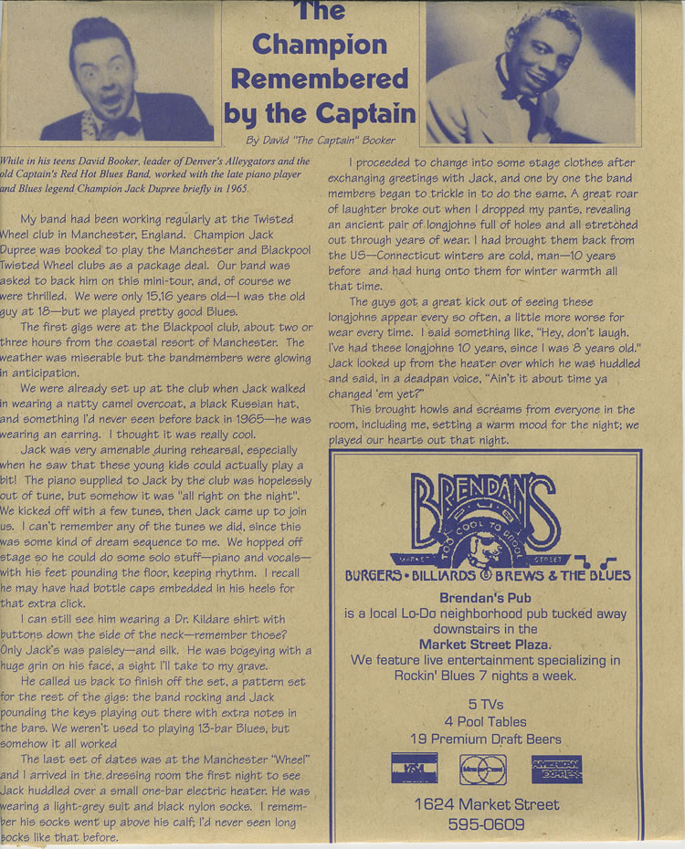 I started picking up the phone and hassling the Abadi Bros at the Wheel for gigs. After playing a few off nights at the Wheel on our own, they gave me the honour of backing Champion Jack Dupree. We really rose to this and did a great job at both Blackpool and Manchester Wheel gigs.