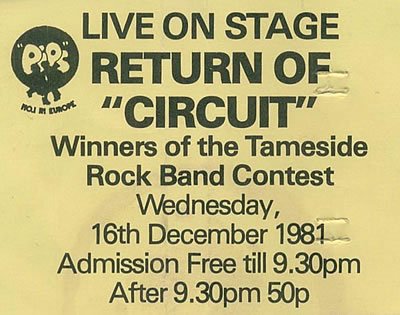 The group entered a Battle of the Bands competition which they won, this created a lot of work around the Greater Manchester area. Out of the 30 groups from all over the north of England who turned up at the Copley Recreation Centre, the Circuit were awarded twenty more points than Tora Tora placed second in the competition.