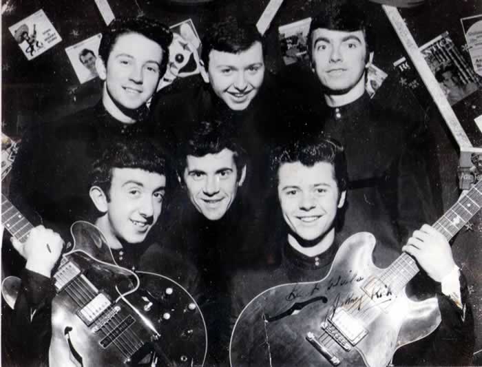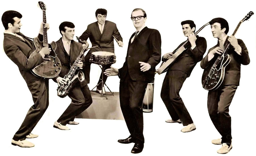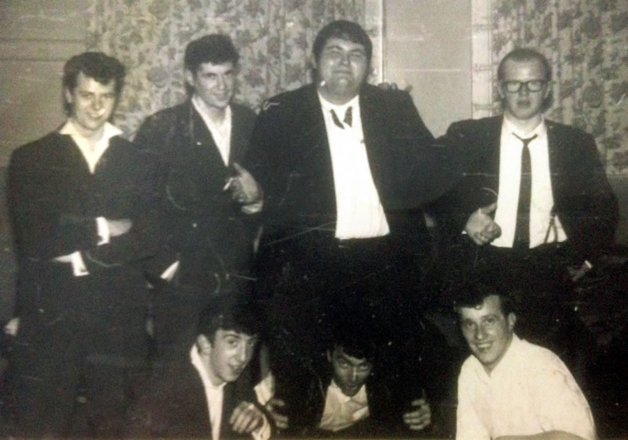 Pictured left to right at Ashton Palais in 1963. Johnny Rich, Lennie Crooks (Sax), Sandy Dyers, Frank Davies, Jimmy Carr, Pete Bird aka Pete Barnes