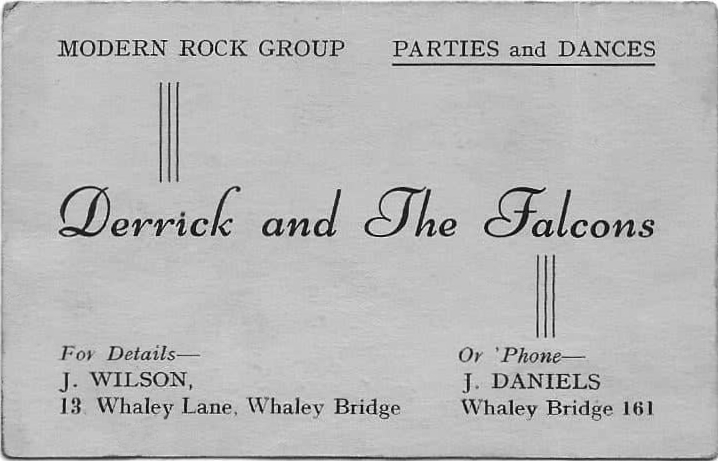 Terry met Derrick Croft when they both worked at Ferodo in Chapel-en-le Frith. During a conversation, Derrick said he fancied being a singer so he took over the main vocals and Terry provided the harmony. They changed their name to “Derrick and the Falcons” (with a ‘c’) but when playing at a club in Sheffield they came across another group called The Falcons. After something of an altercation, they agreed to change their name to “Derrick and the Falkons” (with a ‘k’). Later, when Derrick left and Bill Stopford took over the vocals, they changed the name back to just “The Falkons” (but kept the ‘k’).