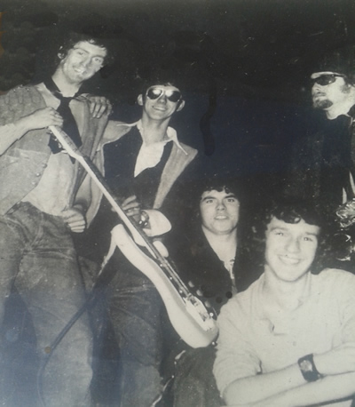 "Flesh" from about 1969/70 L-R Steve Plant, Chris Nelson, Mick Mc Cormack, Mike Holland and Mike Parker. Taken in the garden area at Old Moat Youth Club with my Burns guitar.