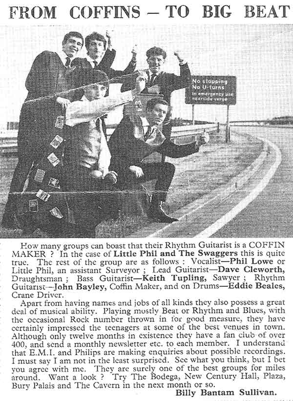 I remember Phil and The Swaggers well. They played at local venues in Cadishead and Irlam . They also went to a coffee bar in Hollins Green on Sundays. Phil was quiet. I think he worked at the steel works and he had a white Triumph Herald. Eddie was funny and worked near the ferry in Cadishead - think it was the paint works. Dave was funny and nice. Derek Grills was quite serious. We used to get a coach from Partington across the water to watch them.