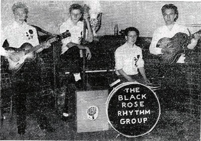 One evening a Mr Maurice Johnson called to enquire if it was live music being played? And would we consider playing at one of his youth clubs. (he later became M.J.Promotions). We didn’t have a name to give him, and came up with “THE BLACK ROSE RHYTHM GROUP”, Toms mother knitted us all a sweater each (see photo).