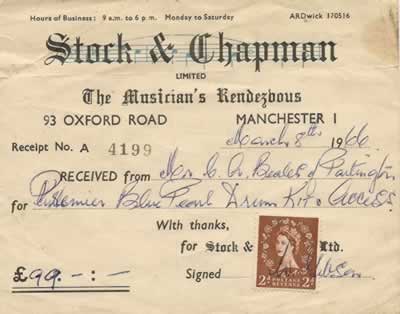 Now the group was earning a few bob, the equipment began to improve. Saturday afternoons were spent touring the music stores of Oxford Street Manchester, along with most other groups, trying out guitars, amps and drums in store names that have long gone - Mameloks, Johnny Roadhouse ,Barretts, and my favourite Stock & Chapman.