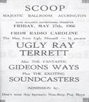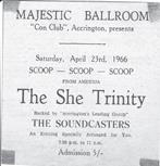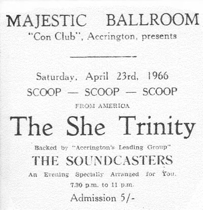 1966 was a very busy year, where the Soundcasters became like a resident band at the Majestic Ballroom, appearing there on no less than 14 occasions. There were a few notable nights at the 'Con'. April 21st stood out, when the lads appeared with all girl group 'She Trinity' from Canada, and as the girls arrived around lunchtime, the band were lucky enough to spend most of the day and night with them! There was also a 'Big Groups Competition' where unfortunately the Soundcasters came second to a band from Preston called Left, Right and Centre. Ugly Ray Terret from Radio Caroline also put in an appearance, with both the Soundcasters and Gideons Ways (ex Scorchers) on the same bill. Finally on Boxing Night the group were given top billing over Warrington band The Vogue.