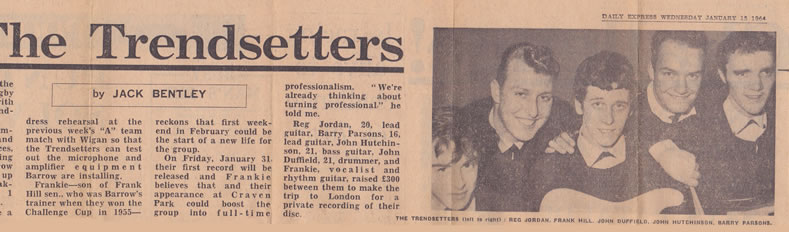 The Trendsetters may well be the first ever band to perform at a sporting stadium venue, I have not been able to find any other stadium gig that pre-dates the trendsetter gig at Barrow rugby league club in 1963. I have The Daily Express story about this from 1963.