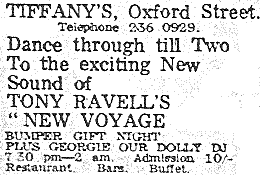 When I worked at Tiffany's, Bill Pye was manager. Tony Ravell's New Voyage was the resident band. Tony played bass, a sunburst Fender precision. Clem Lee was drummer Shann and Sheen the singers Jim played Hammond organ can't remember the guitarist. But later the blind guitarist was Billy who could also play Elton John's Your Song on piano. Sheen left and Shann was with Jean Barrow (nee Harris).Shann left at the same time as Clem, who were married,to start a recording studio in Manchester. So in came Linda Rothwell to replace Shann. Jean married Herman Hermits, ex bassist Dave Barrow. Today Shann sings on a regular basis in Deal, Kent. Jean still sings in Manchester. Linda Rothwell moved out to the States and still sings too.