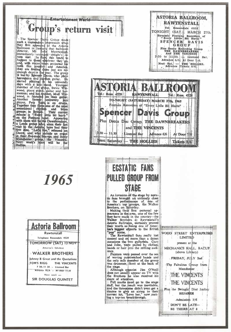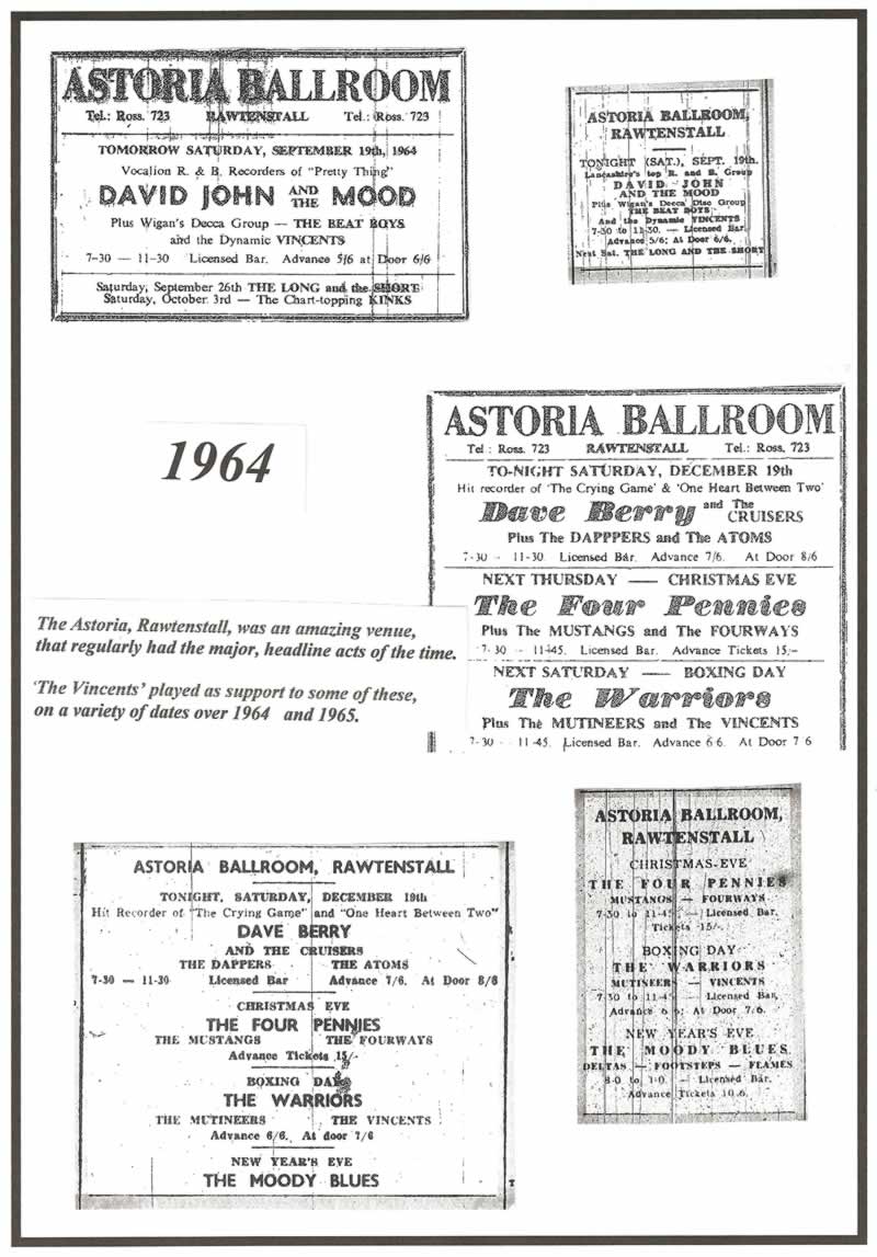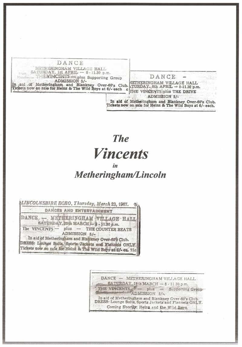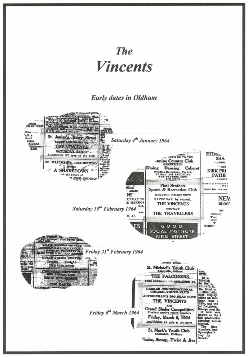 A tour of Cornwall and Devon was undertaken during the summer of 1965. Also, ‘The Vincents’ became regular visitors to the Huddersfield area playing on countless occasions -- at the ‘Tahiti 2’ Club on Venn Street and also at the ‘Sheridan Rooms’ ballroom/dance hall.
