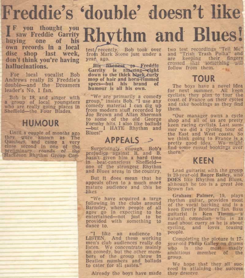 Here is a extract from our website it refers to my father in general, but you may like to put The Four Blades section upon your site; although my father did play the keyboards with the band as well as manage it; will try to send photos of the group soon....photographed on Sheffield City Hall steps and at various places around Sheffield...also there is their last "Tour de France" ; )....where Graham Palmer & Roger Bailey were involved in a car crash....there is also an interseting newspaper cutting that I'll scan for you, just on The Four Blades.