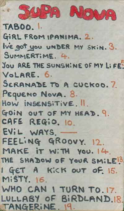 He then joined Didsbury based Latin jazz quartet"Supa Nova" 1976 with Jerry Wrexham [keys], Brian Marks [flute], Neil Reading [drums, later with Wayne Fontana], Bill Robinson [tenor sax].
