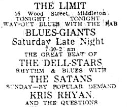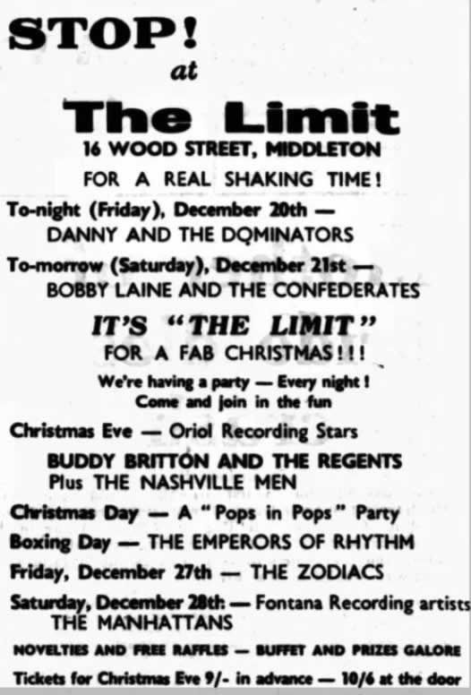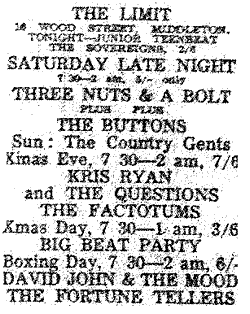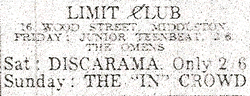 Saturday 19th June 1965 - The Vincents played at 'The Limit'. Clearly remember the deco, with road signs, traffic signals etc. Remember it as being a small venue and quite a lot of stairs to hawk the gear up. Small stage and dance floor but great atmosphere.