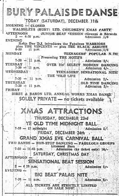 Members' Notice Bury Palace Theatre Club Bury Palace Theatre Club Bury Palace Theatre Club Garden Street. Telephone Bury 3777. Opening Sunday, November 13 Under the supervision of the Palace Theatre Club, Sale. (There is no connection whatsoever with the former Barbary Club.) Announcing The Weekly Attractions Already Booked Opening Week The Terrific Wee Willie Harris Show with a Wonderful Company. Wee Willie And The Comets Decca's Paul Andrews The Foo Young Choong Ronnie 'Charlie Chaplin' Collis Etc., Etc. -And To Follow- A Great Double '' Top '' Show The Dynamic Group One And Australia's Fabulous Johnny Laycock Donald Peers Robert Earl Lester Ferguson The 5 Dallas Boys Mike & Bernie Winters And A Host More Stars. All Shows Presented by Our Resident Compere - the Popular Alan '' Sing It With Me '' Black Application For Membership Can Be Made Now At The Theatre Or In Writing To The Hon. Secretary. Subscription Rates: £1/1 per annum. Ladies 10/6. Entrance (Members) 1/6. Guests 2/6. Applicants must be over 21 years of age.