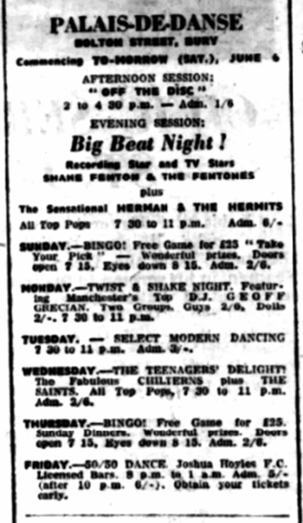 I was a frequent visitor to Bury Palais and the "Prinny" in the middle to late 60s. In the Palais we used to walk around the dance floor anti clockwise. There were plenty of fights and the girls were worse than the fellas lol Big Joe Howarth was a popular bouncer and the smell of cherry b sick is still in my nose!!!!