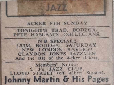 Also a band that played at the Bodega, was a great Manchester group called 'The Saints Jazz Band'. whom I believe were