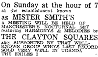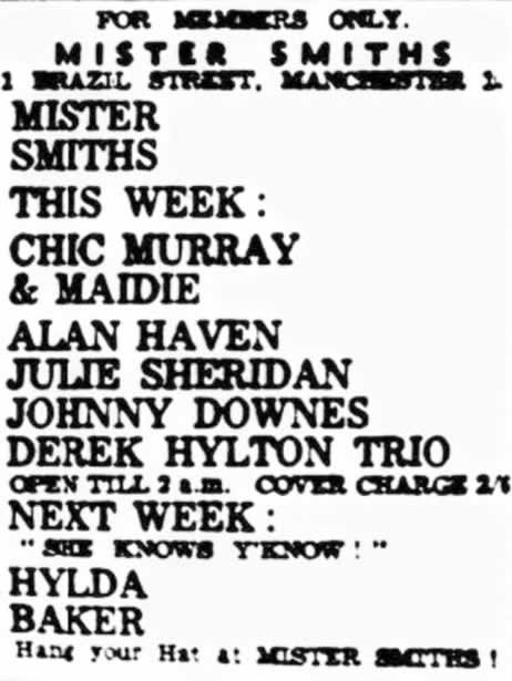 Mr Smith's was at 1 Brazil Street off Whitworth Street, Manchester 1 and opened on Monday, March 25, 1963 with Alan Haven with George Walker and the Tony Charlesworth Quartet.