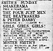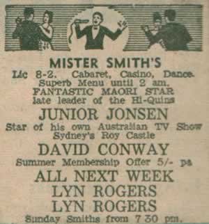"In the very early sixties, most of the groups went to Mr Smiths for a drink, after they had finished their gigs and got back to town. You were always sure of bumping into some one you knew. Most of us got free membership, I don't know if it was because we were musicians or we just spent a lot of money there. They nearly always had top line acts on, among others I remember seeing Johnnie Ray with the Derek Hilton Trio, they did a private show after the club closed, Johnnie was asking those who had stayed what was their favourite song, then he would sing it, he knew the words to every thing, I will never forget that night, what an entertainer.