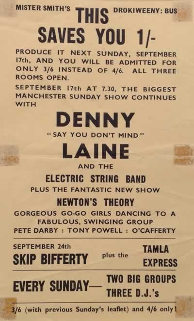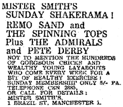 The second date with my late wife was at Mr Smiths to see Los Zafiros just after easter 1965. Glad my heyday was the 60's.The Manchester club scene was fantastic in those days....!