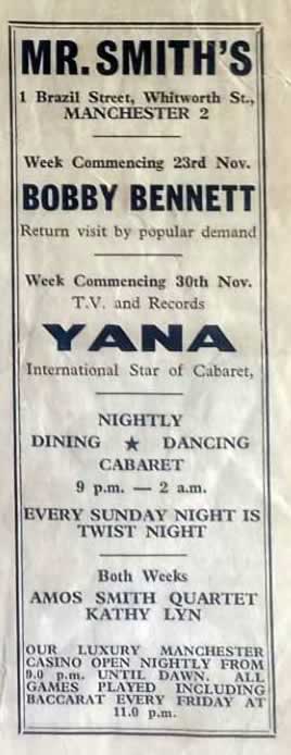 I worked in Mr Smiths in Manchester in the sixties. Bill Macleish was the general manager and I was the entertainment manager/compere. We had all the top acts there including Dusty Springfield, Tommy Cooper as well as all of the top groups.