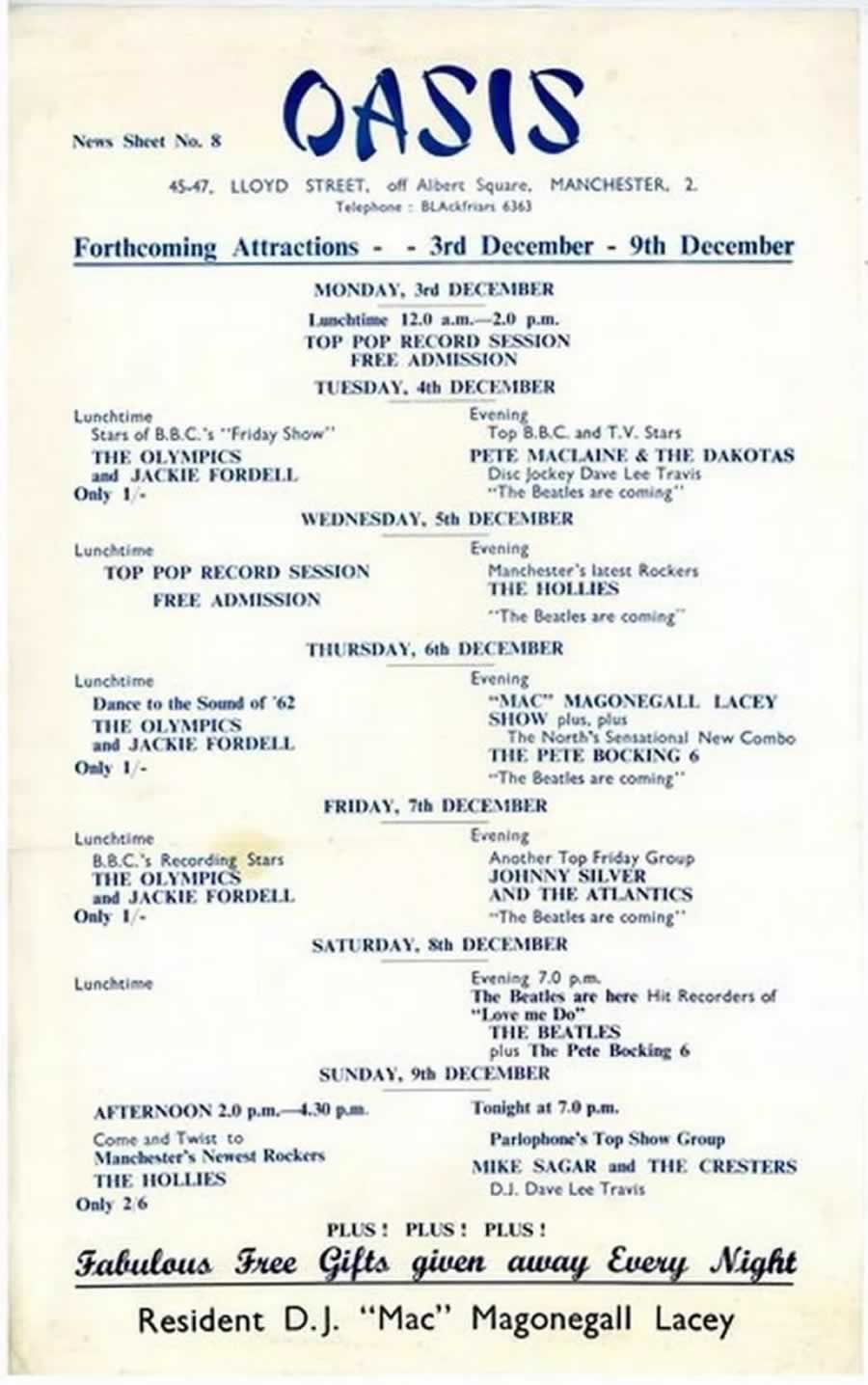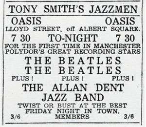 So this was how The Oasis, 'Manchester's Most Fab Club For Young People,' opened for business. Just three months later The Beatles played this famous club for the first time, making their début here on Friday, February 2, 1962 and about 300 people came to see them. It was also their first professionally organised gig outside of Liverpool. It was arranged by one of the clubs founders Tony Stuart.