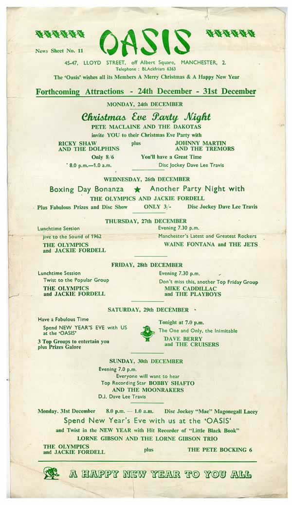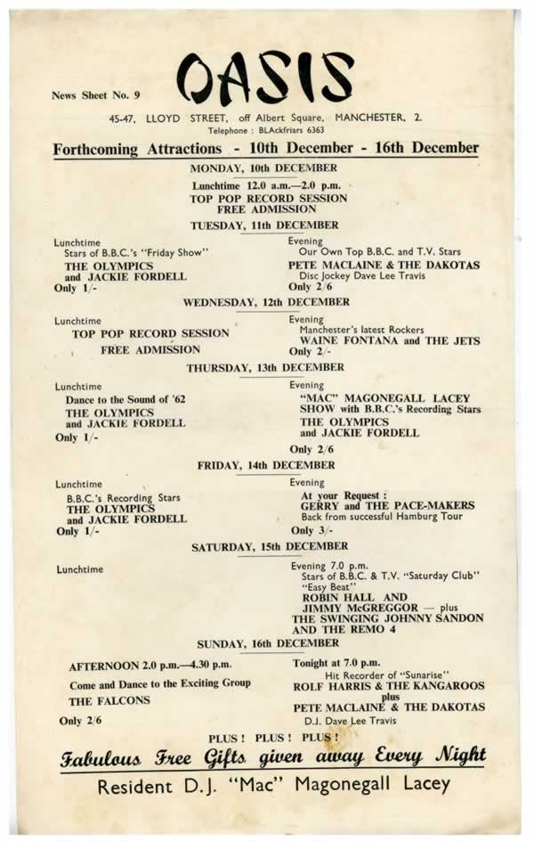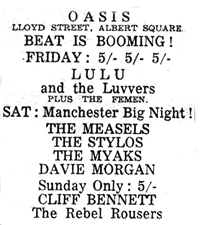 The Oasis Club was at 45-47 Lloyd Street off Albert Square, Manchester 2 and opened on Saturday, November 4, 1961 with Dick Charlesworth and his City Gents with Jackie Lynn.