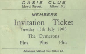 Drummer with the Cymerons and Manchester Federals, Saturday afternoon for me was Barretts and Mamelocks Oxford St, played at the Oasis many times probably 16 or 17 years old at the time. Still playing today but gone electronic these days, living in Dubai for the last 6 years coming home soon to join up with Mike Lynch and the boys see if we can knock out a bit of Blues, great memories from the sixties wish it was still here.