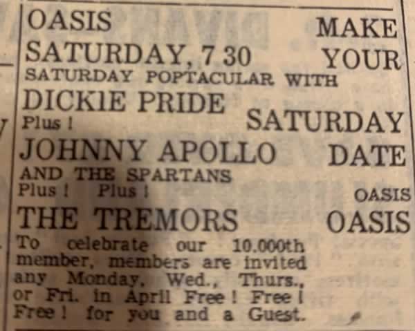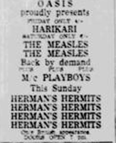 I played at the Oasis in 1966, the first gig was on the small stage when I was with Lee Wade and the Wild Ones, the second was on the large stage with The Rockin Vicars. It was a great place!