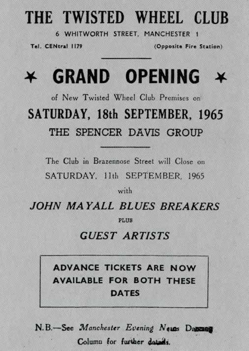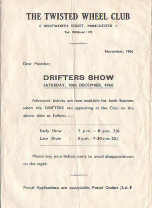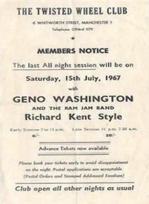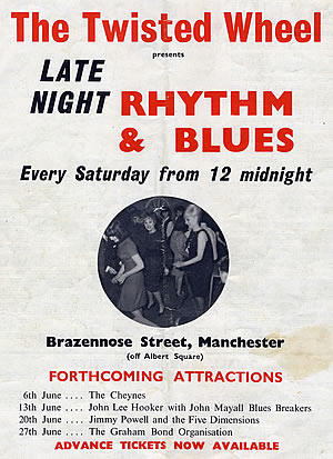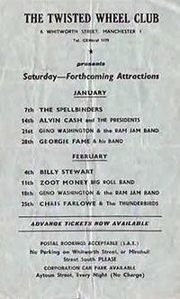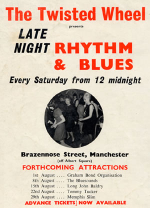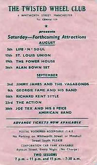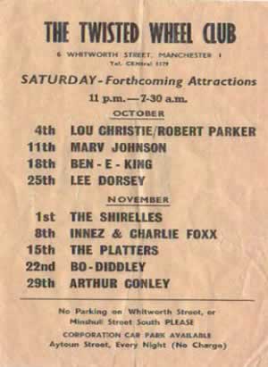 I remember the Twisted Wheel club in Brazennose Street and later at Whitworth St. I attended reularly from about 1963 to 1965. I saw many artists including Sony Boy Williamson. I went to the all night sessions and the next day the dedicated went to Blackpool, where we finished off the weekend with more clubbing.