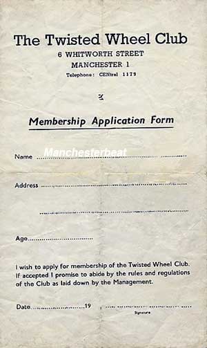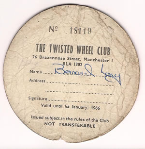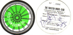 Best times of my life at the Wheel, it was brilliant, really good memories, always dancing. In the arch corridor used to go down there nearly every week in 68/69. I'd love to get in touch with Brian Mcnearn from Selby, Malc Paton from Barrow and Joyce Mayale from Bury to talk about the good times we had at the Twisted Wheel in 68/69. Blue then green membership cards