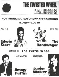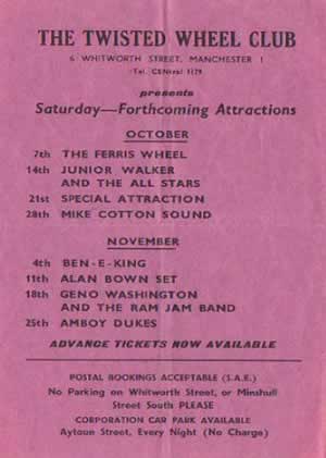 Home to the more r'n'b sounds that were becoming popular post the Liverpool and Manchester beat boom of the early sixties, the club has maintained a cult status amongst club goers of the time and still holding "Wheel nights" for soulies. Home to the famous all-nighter's, the Wheel hosted many of the world's top soul acts - Sam and Dave, Ben E King as well as many top UK acts such as Geno Washington, Root and Jenny Jackson and St Louis Union (c'mon we have to get a Manchester band in there somewhere).