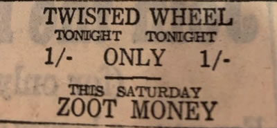 It was Zoot Money. A few minutes later we were down the Wheel watching him on stage with the Big Roll Band, like a true professional.