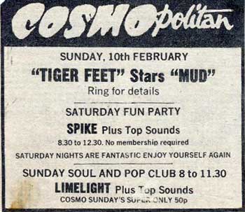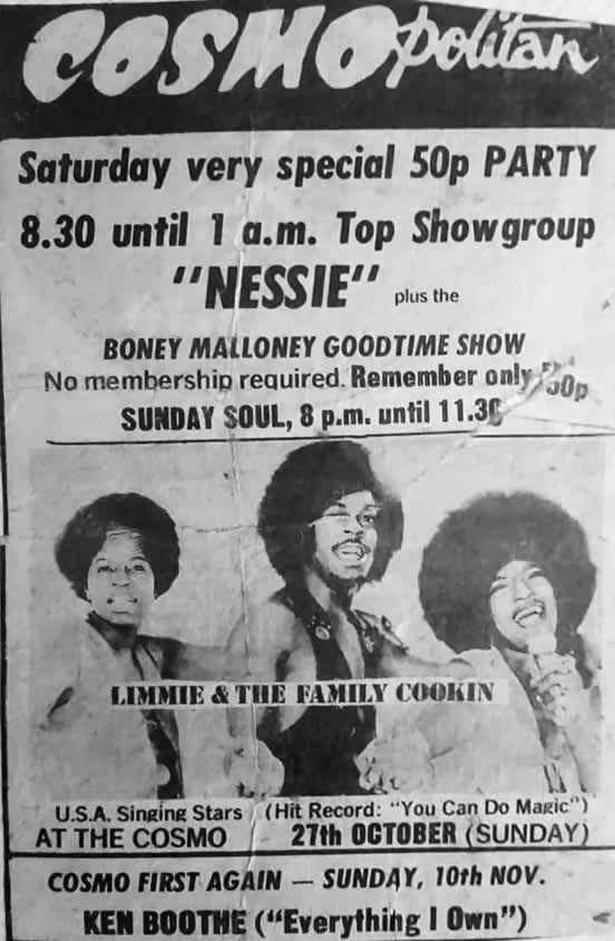I recall the Cosmo fondly. I ended up helping out the DJ there for a while - 18 months, I think. He was a top lad, called Feds, who just loved his soul and particularly the Four Tops. We used to get a couple of quid a night and a little more if a band didn't show. We had record decks high up on the right as you walked in, looking out over the main dance floor and the stage. We took our own records, bought our own beer (jumped the queue at the back entrance of the top bar) and had a ball. We had a large spotlight that shone on the stage but was also used to pinpoint any rowdiness for the door staff. A great guy called Ronnie Leighton ran the front of house. Good memories...
