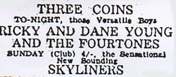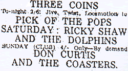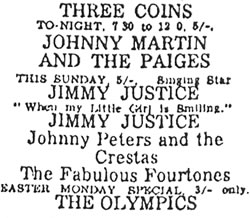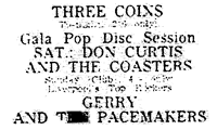 What a great gig the Three Coins was, we used to play there a lot with the Fourtones. It always had a good atmosphere (and was always full), also a good pub (the Crown) across the street where you could cool off after doing your set.