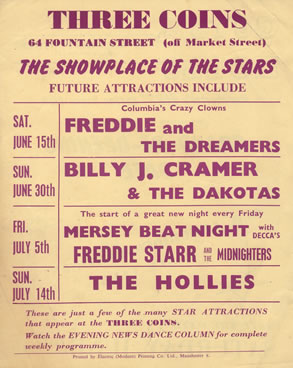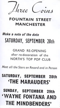 I frequented the Three Coins from 1962 to around 1967. It was orginally opened by either Kennedy Street Enterprises or some of the owners and intended as a showcase for groups managed by them. Regular live acts included Freddie and the Dreamers and I recall one night, Freddie in his running from side to side of the stage kicking a fire extinguisher off the wall and causing mayhem with the live equipment on stage.