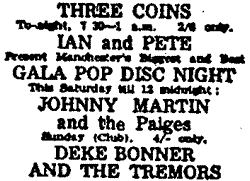 Another good thing about the Three Coins was that they presented some great jazz players including Don Rendell and the great Manchester trumpet player Bert Courtley (who died at the young age of 35) and George Melley of course. The 'All Night Jazz' featured on a Saturday night. Wonderful Days !! In the 60s I played with a few of the local Manchester Soul Bands including the A-side (Ugli Ray Teret recorded us) and The Dreamweavers. Does anyone remember these groups - or play with them ?