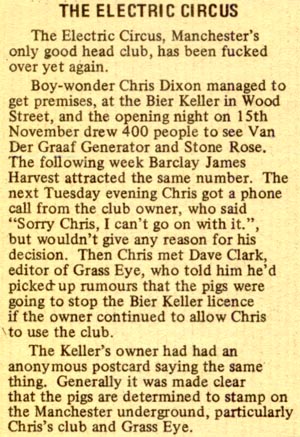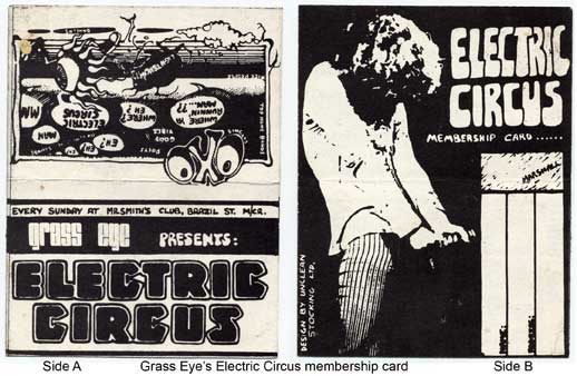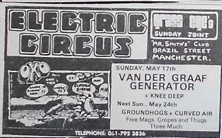 We started off with pub gigs and graduated to regular weekly nights at The Magic Village and Mr. Smiths, where we ran the original Electric Circus (the late-seventies one just lifted the name!) I've attached an ad from the May 23-June 6 1970 edition of Time Out (North West)