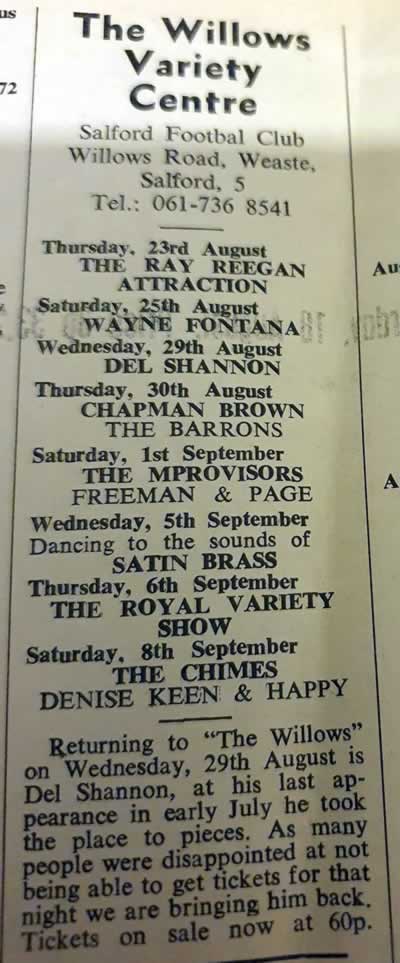 Went there to a fund raising benefit gig for Dave Morris who was too poorly to drum any longer for the Salford Jets. As I remember, the line up was as follows. The Dakotas, Herman's Hermits. Dave Berry and the Cruisers, The Troggs. Mike Sweeney's Thunderbirds, Dave Dee,Dozy ,Beaky Mick and Tich and Wayne Fontana,all doing it for free. That's how decent musicians are!!! Every band put in a superb performance, made the evening pleasurable and financially helpful for David who was a superb drummer and good company in his time on this planet. Bless him.