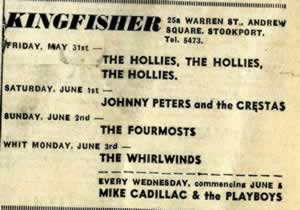 The Kingfisher Club in Stockport was previously called the KoQuete Club which was above a car show room in Andrews Square. The Hollies played there. The floor used to vibrate when you were dancing and loud music was played.